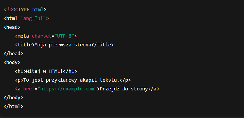 lang=”pl” – atrybut określający język zawartości strony (w tym przypadku polski). Dzięki temu przeglądarki i czytniki ekranowe lepiej rozumieją treść.