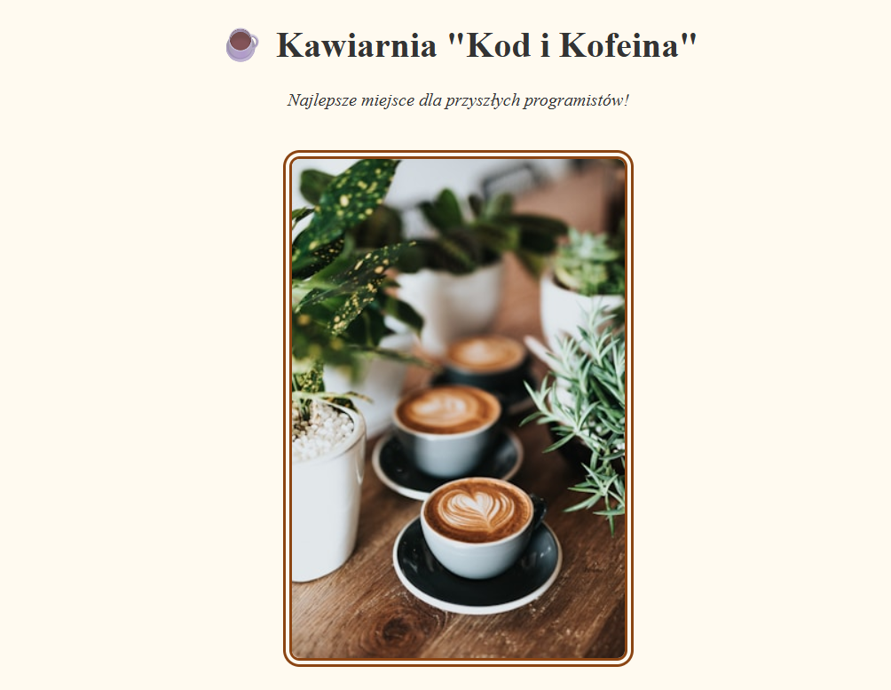 Nagłówek: Nazwa kawiarni w <h1> i krótkie motto w <i> (kursywa).