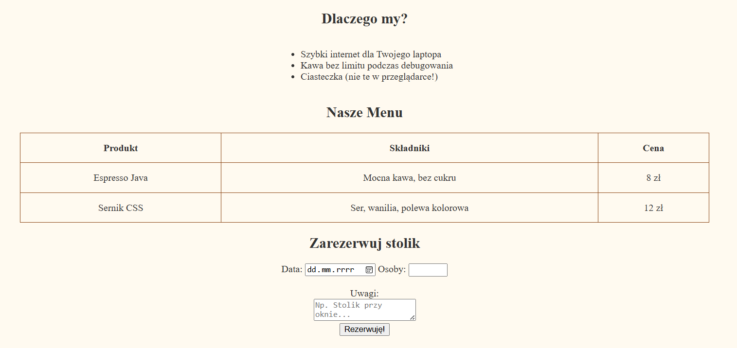 Cel: Stwórz stronę internetową dla małego lokalu gastronomicznego. Musisz pokazać menu, godziny otwarcia oraz formularz rezerwacji stolika.