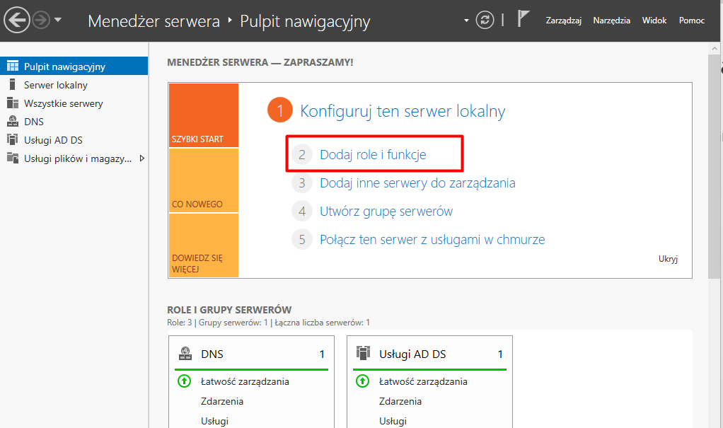 Najpierw musimy uruchomić Menedżer serwera i wybrać opcję Dodaj role i funkcje: