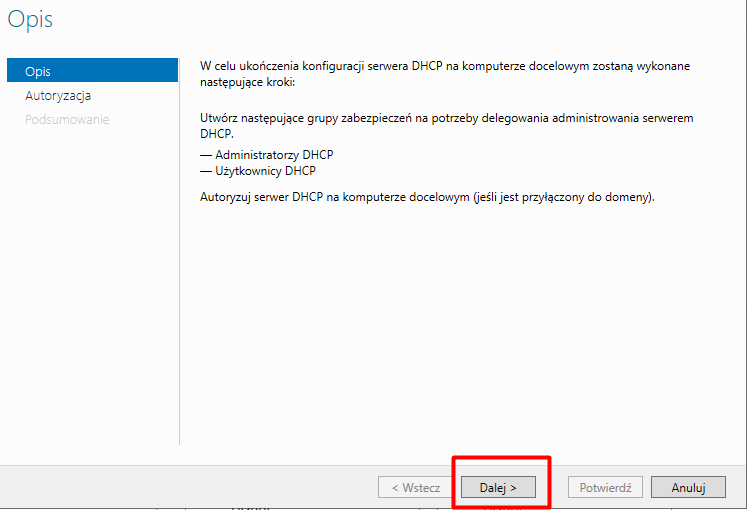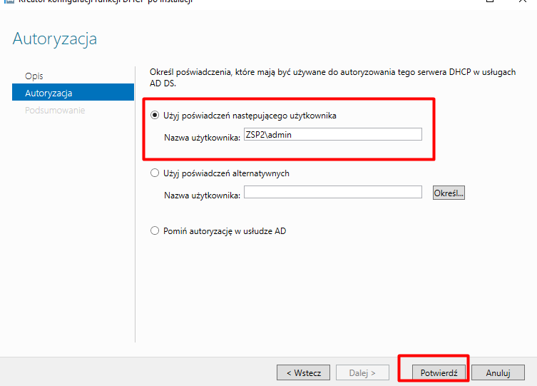 Możemy wskazać użytkownika z uprawnieniami do autoryzacji DHCP w Active Directory. Pozostawiamy Administratora i klikamy Potwierdź.