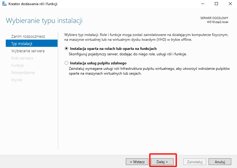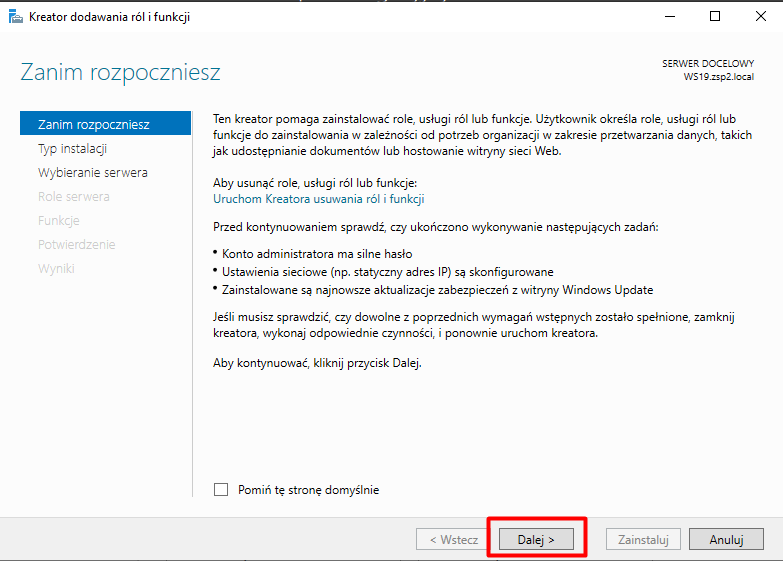 Zostawiamy zaznaczoną domyślną opcję i przechodzimy Dalej: