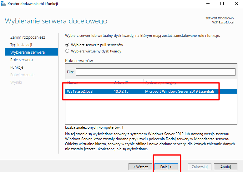 Wybieramy nasz serwer (jeśli jest jeden, będzie już zaznaczony) i przechodzimy Dalej: