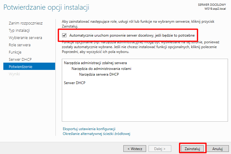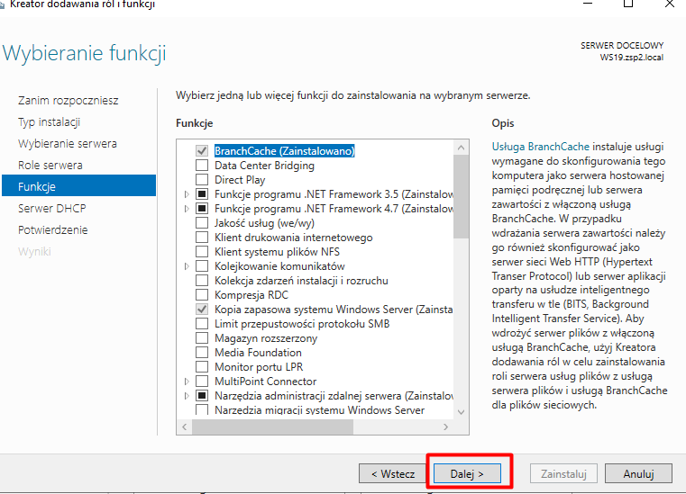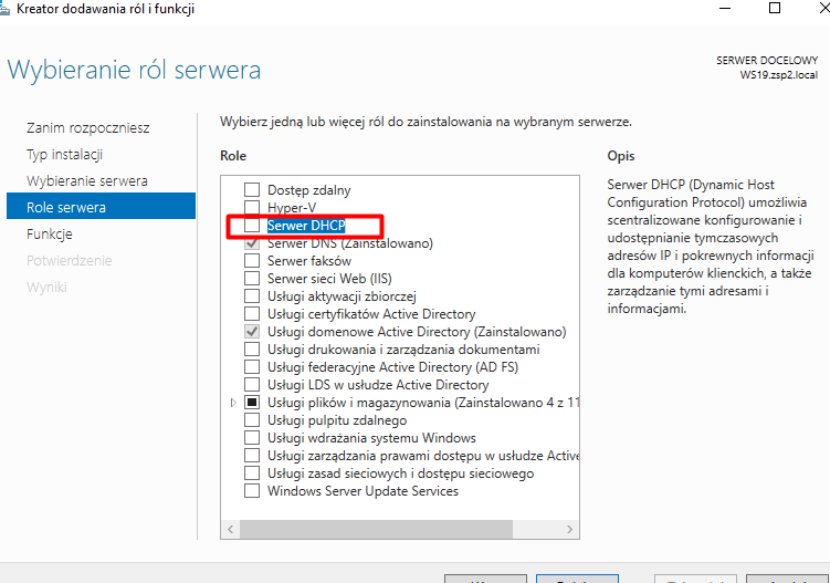 Zaznaczamy rolę DHCP: