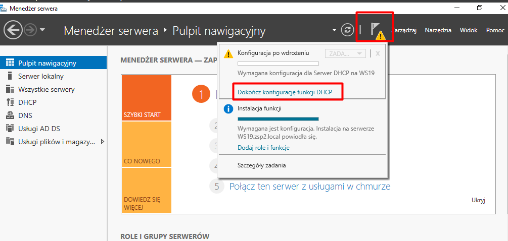 Proces instalacji potrwa chwilę. Można zamknąć okno instalacji – proces nadal będzie widoczny na pasku górnym. Po zakończeniu instalacji, jeśli pojawi się symbol wykrzyknika, klikamy na ikonę flagi i wybieramy opcję Dokończ konfigurację funkcji DHCP.