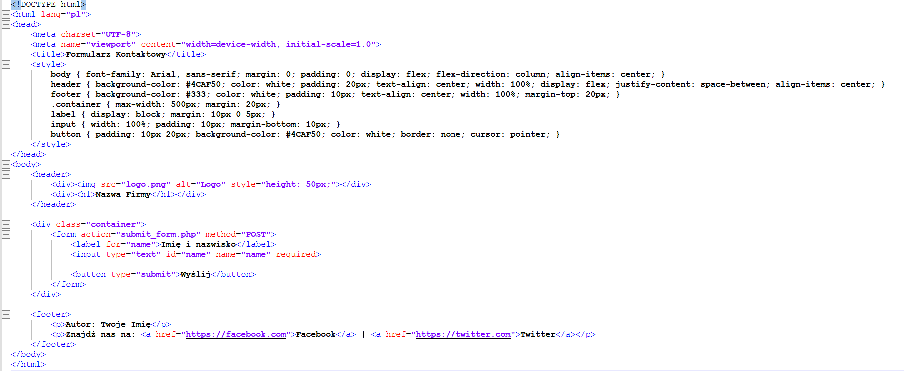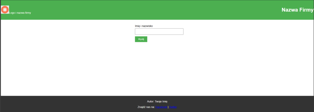 Struktura kodu powinna zawierać stronę główną, z podziałem na header, body oraz footer. Formularz w części body przyjmuje name (Imię i nazwisko), a dane są zapisywane do bazy danych po wysłaniu. Przykład wyglądu strony: