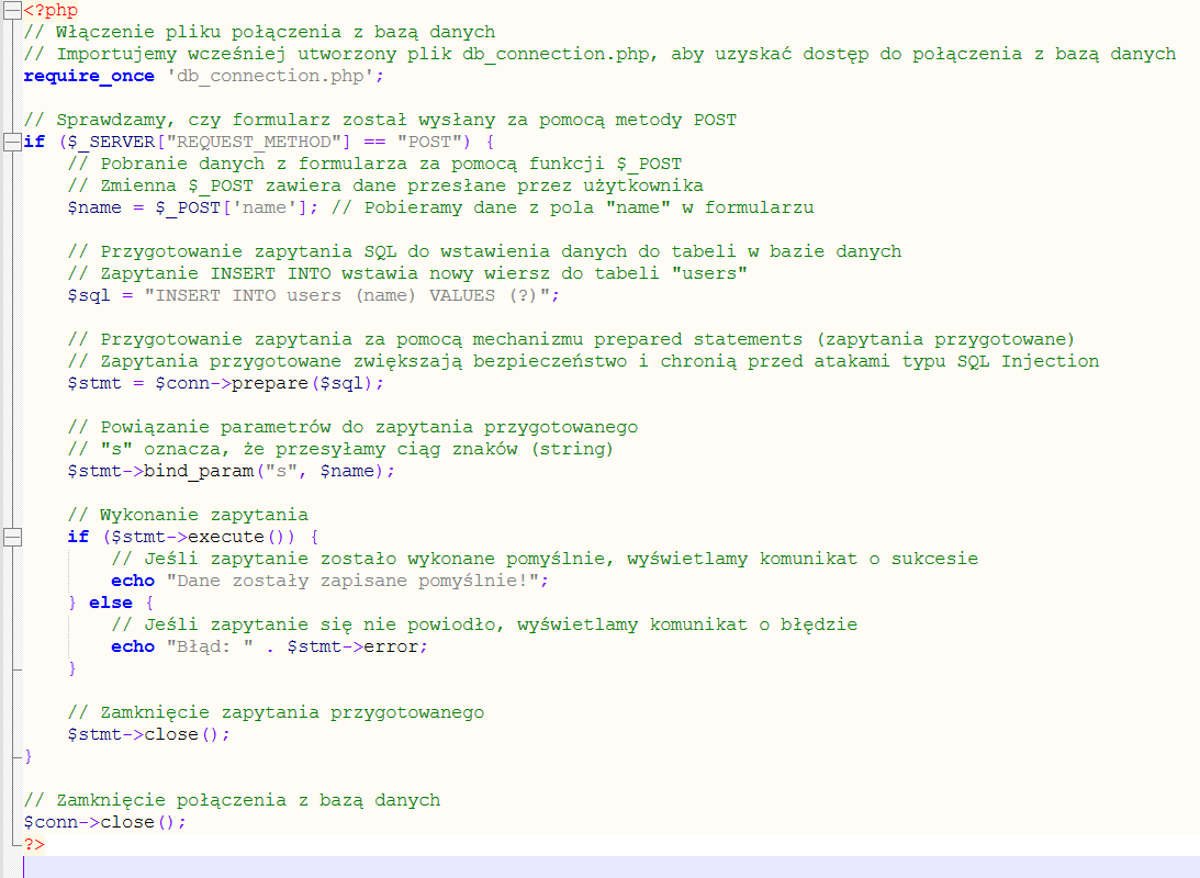 Ten skrypt pobiera dane z formularza (name) i zapisuje je do bazy danych my_website wraz z komentarzami wyjaśniającymi każdą część: