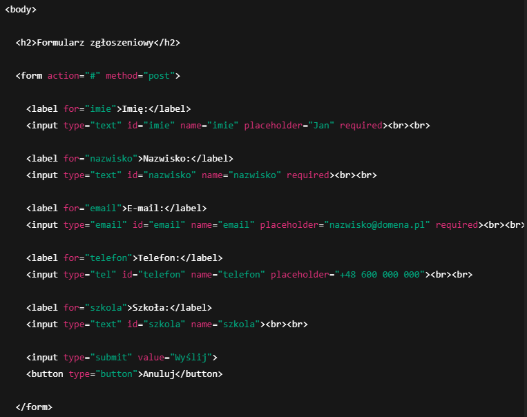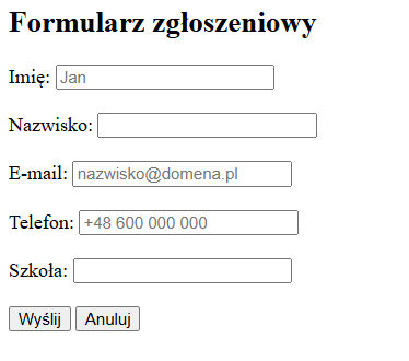 <input type="text" id="imie" name="imie" placeholder="Jan" required>