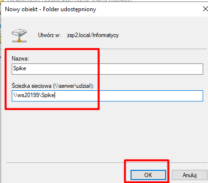 Wprowadzamy nazwę udziału Spike oraz ścieżkę sieciową `\\ws20199\Spike`, po czym klikamy „OK”.