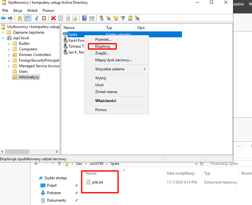 Teraz nasz folder jest dostępny z poziomu AD. Wystarczy zaznaczyć go, kliknąć prawym przyciskiem myszy, wybrać opcję „Eksploruj”, aby zobaczyć jego zawartość.