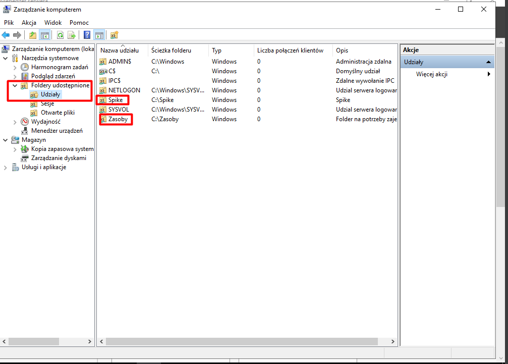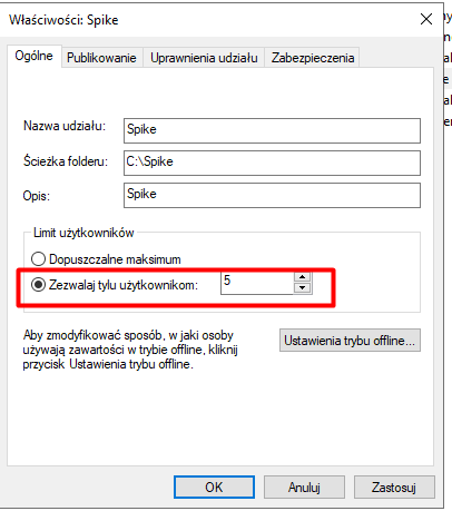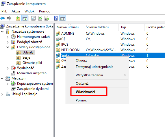 Teraz chcemy opublikować nasz udział w Active Directory (AD) oraz ustawić limit jednoczesnych użytkowników korzystających z zasobu. Warto dodać, że publikacja udziału ma ograniczone zastosowanie, ale ustawienie limitu użytkowników może być bardzo przydatne. Przechodzimy do zakładki „Udziały”, klikamy prawym przyciskiem myszy na folder „Spike”, a następnie wybieramy „Właściwości”.