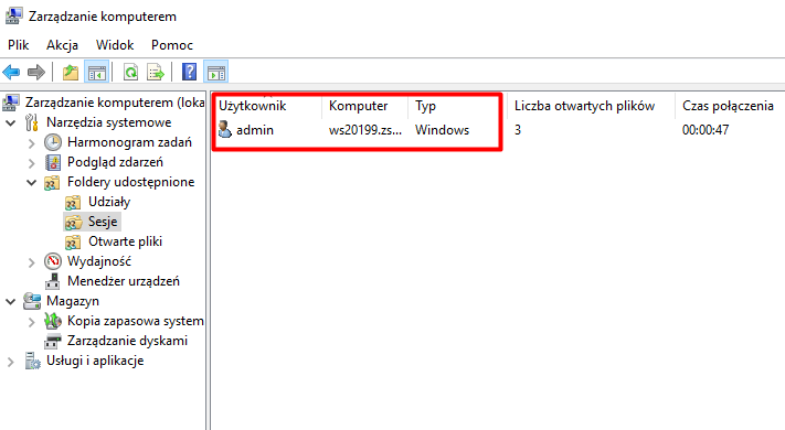 W zakładce „Sesje” znajdziemy szczegóły na temat tego, kto jest obecnie podłączony do zasobu i z jakiego urządzenia.