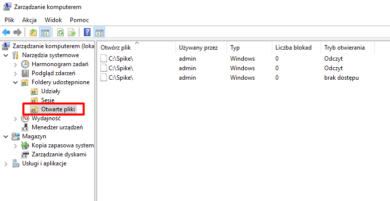 Aby otworzyć to narzędzie, wystarczy wpisać „Zarządzanie komputerem” w polu wyszukiwania lub wybrać Narzędzia i zjechać niemal na sam dół listy. Następnie, z menu po lewej stronie, wybieramy „Foldery udostępnione”, a potem „Udziały”. Zobaczymy listę udostępnionych folderów, z informacją, że do udziału „Spike” jest aktualnie podłączony jeden użytkownik.