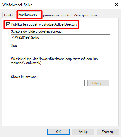 Aby opublikować nasz folder w AD, przechodzimy do zakładki „Publikowanie” i zaznaczamy opcję „Publikuj ten udział w usłudze AD”. Na zakończenie klikamy „Zastosuj” i „OK”.