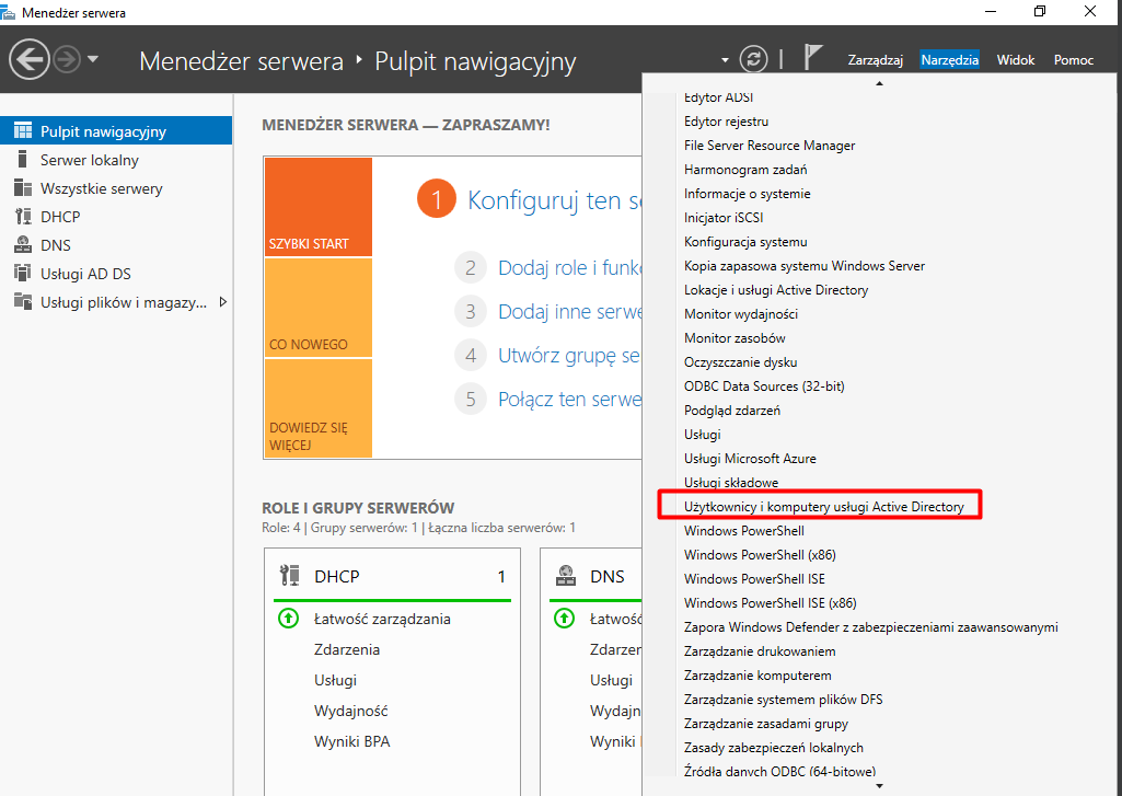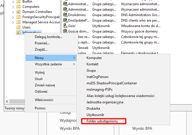 Możemy również uprościć dostęp do udostępnionego folderu bezpośrednio z poziomu AD. Otwieramy przystawkę „Użytkownicy i komputery usługi AD” i w wybranym miejscu (np. w jednostce organizacyjnej „Informatycy”) klikamy prawym przyciskiem myszy, wybieramy opcję „Nowy”, a następnie „Folder udostępniony”.