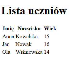 <th>Imię</th> <th>Nazwisko</th> <th>Wiek</th>