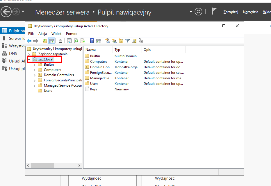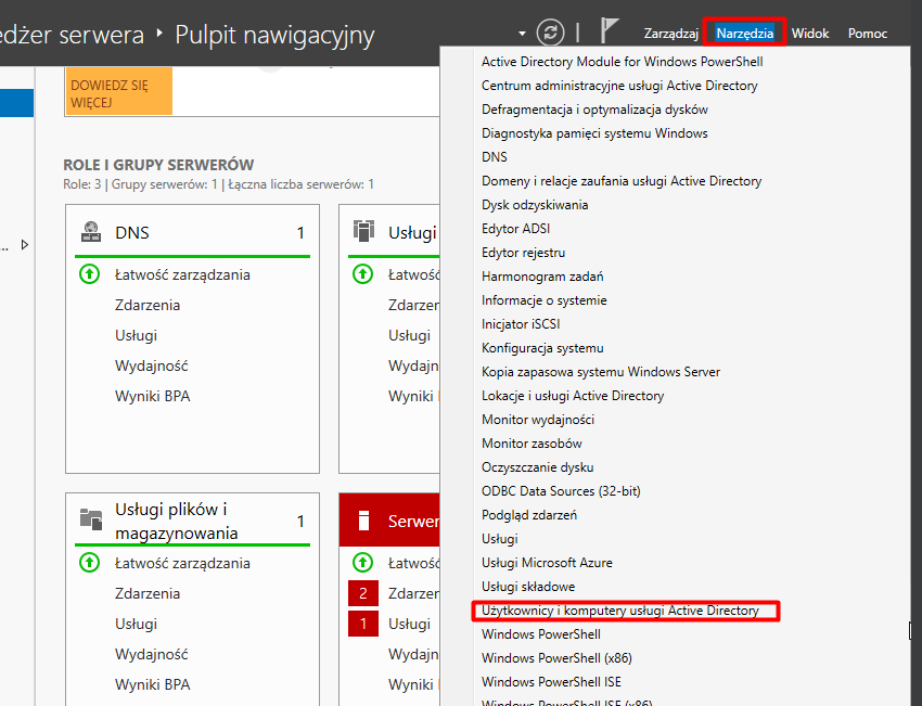 Aby utworzyć nowego użytkownika należy wybrać z górnego menu „Menedżera serwera” opcję „Narzędzia”, a następnie przystawkę „Użytkownicy i komputery usługi Active Directory”: