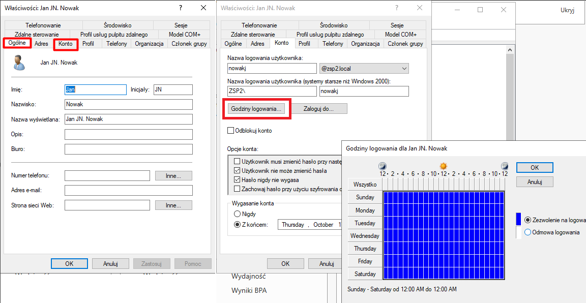 W dowolnym momencie możemy zmodyfikować właściwości użytkownika. Zaznaczamy nasz obiekt i PPM naciskamy „Właściwości”. Widzimy klika zakładek, z których interesują nas na chwilę obecną dwie – „Ogólne i „Konto”. W tej pierwszej zakładce mamy takie ogólne informacje o naszym obiekcie, a w zakładce „Konto”, możemy dokonać sporo zmian. Na przykład możemy wyłączyć konto, ustawić jego czas wygasania, odblokować je itp. My najpierw wybierzemy „Godziny logowania”: