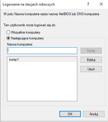 Natomiast z opcji „Zaloguj do” możemy ograniczyć logowanie użytkownika do konkretnego komputera: