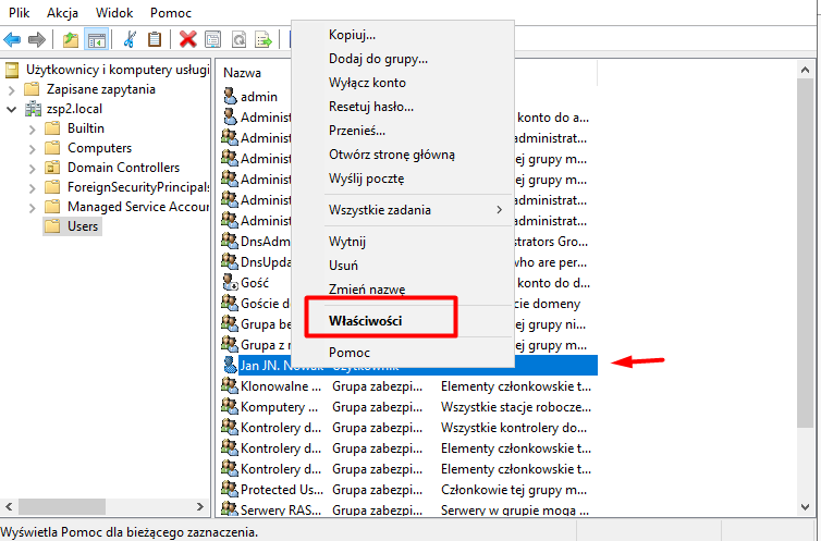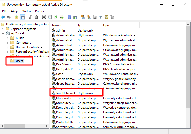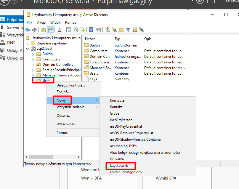 Następnie zaznaczamy kontener „Users”, w którym będziemy tworzyć użytkownika i PPM wybieramy „Nowy” i „Użytkownik”.: