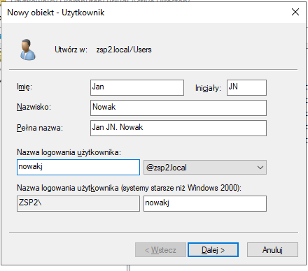 Podajemy dane użytkownika i naciskamy „Dalej”:
