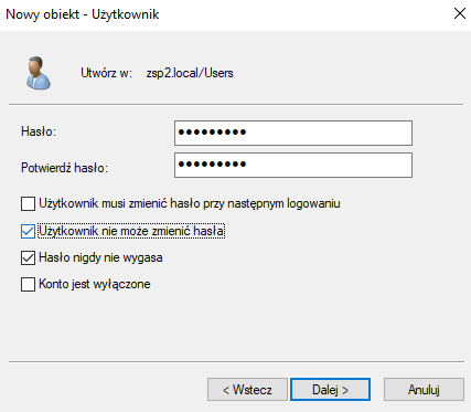 Podajemy hasło i wybieramy interesujące nas ustawienia konta i naciskamy „Dalej”: