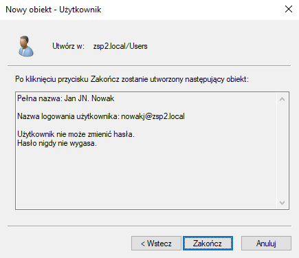 Na koniec mamy jeszcze informacje o tym z jakimi właściwościami zostanie utworzone nasze konto i naciskamy „Zakończ”: