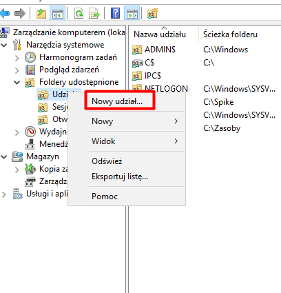 Tym razem utworzymy folder sieciowy bezpośrednio z poziomu „Zarządzania komputerem”. W menu po lewej stronie wybieramy „Udziały”, klikamy prawym przyciskiem myszy i wybieramy „Nowy udział”.