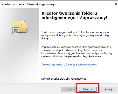 Otworzy się „Kreator tworzenia folderu udostępnionego”; klikamy „Dalej”, aby kontynuować.