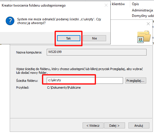 Następnie wprowadzamy nazwę folderu oraz ścieżkę dostępu (w tym przykładzie `c:\Ukryty`). Klikamy „Dalej”. Jeśli folder jeszcze nie istnieje, potwierdzamy jego utworzenie, wybierając „Tak”.