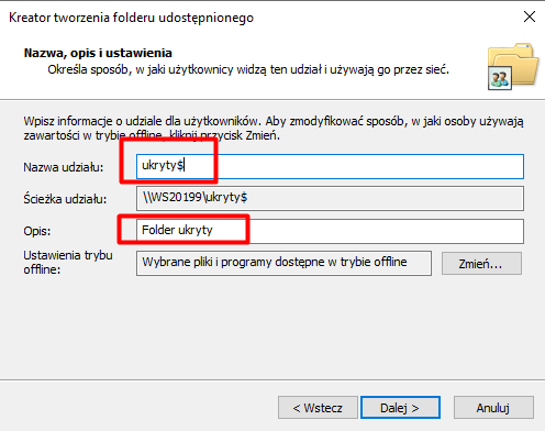W kolejnym kroku wykonujemy kluczową czynność: ukrywamy folder, dodając „$” na końcu nazwy udziału. Opcjonalnie możemy dodać opis, np. „Folder ukryty”, po czym klikamy „Dalej”.
