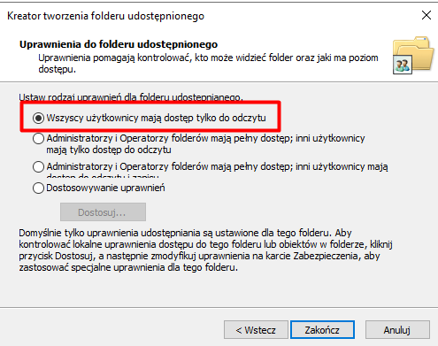 Istnieje możliwość przypisania dodatkowych uprawnień do folderu, ale na potrzeby tego ćwiczenia pozostawiamy ustawienia domyślne i klikamy „Zakończ”.