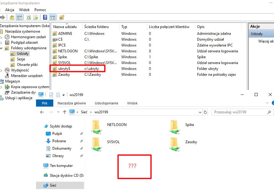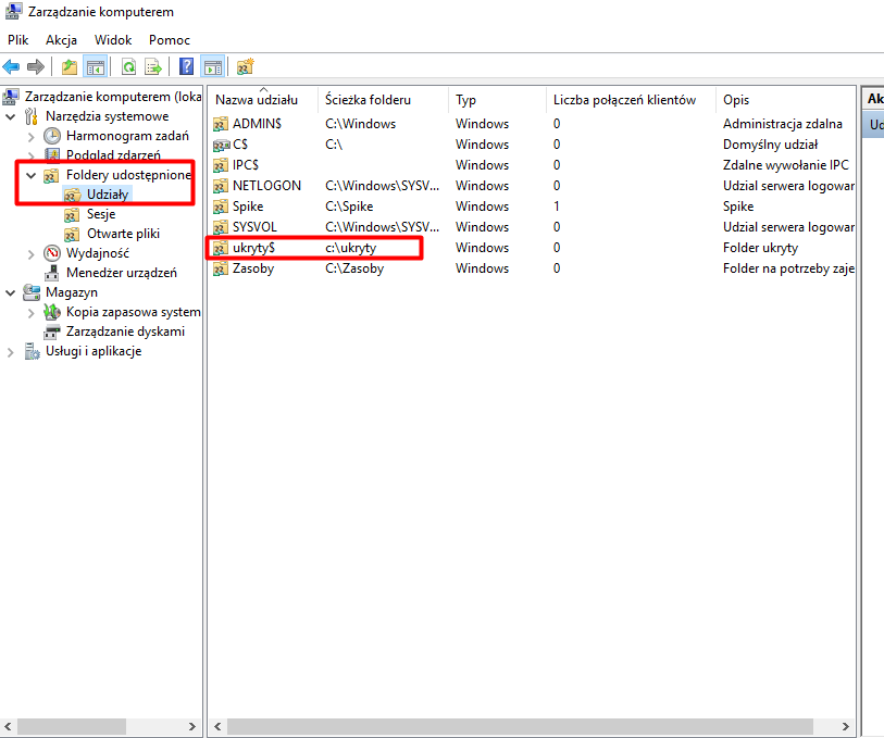 Zarządzając zasobami sieciowymi za pomocą narzędzia „Zarządzanie komputerem”, możemy zauważyć, że niektóre udziały kończą się znakiem „$”. Oznacza to, że taki udział jest ukryty w sieci – można uzyskać do niego dostęp wyłącznie po wpisaniu pełnej ścieżki. W tym punkcie utworzymy właśnie taki ukryty udział.