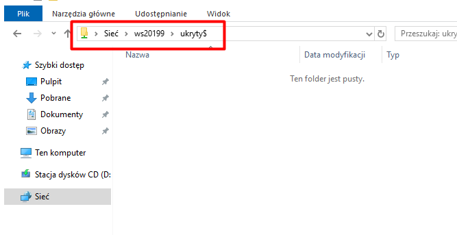 10. Gdy jednak wpiszemy pełną ścieżkę `\\server00\Ukryty$`, mamy dostęp do folderu Ukryty$.