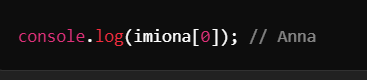 Możemy odwołać się do elementów tablicy za pomocą ich indeksów. Na przykład pierwszy element w tablicy to imiona[0], drugi to imiona[1] itd.
