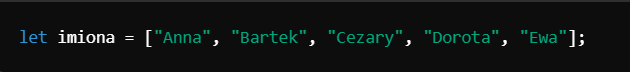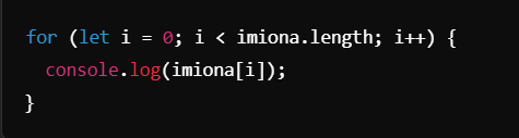 Możemy użyć pętli for, aby przejść przez wszystkie elementy tablicy. Długość tablicy uzyskujemy za pomocą imiona.length.