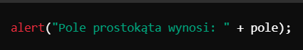 Do wyświetlenia wyniku na ekranie możemy użyć funkcji alert(), która pokazuje okienko z wiadomością.