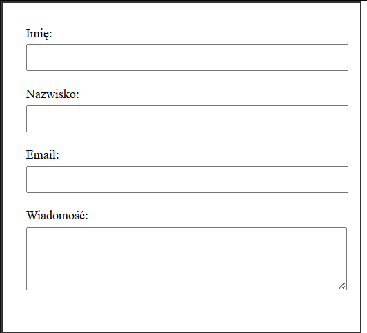 – Stwórz formularz z 4 polami: Imię, Nazwisko, Email, Wiadomość (pole tekstowe).
