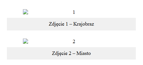 – Dodaj podpis (<p>) pod każdym obrazkiem z padding: 10px i tłem.