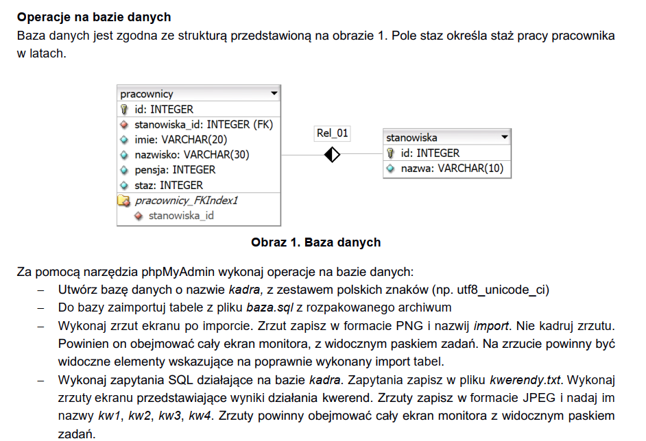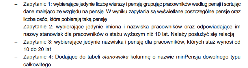 Zaktualizuj kolumnę minPensja w tabeli stanowiska, ustawiając ją na zaokrągloną w dół wartość średniej pensji dla danego stanowiska (AVG rounded down). (Użyj jednego zapytania UPDATE z JOIN).