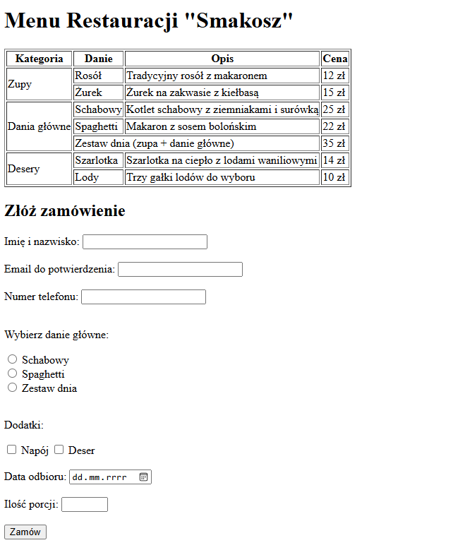 Strona powinna posiadać nagłówki (<h1>, <h2>) opisujące sekcje: „Menu restauracji” i „Formularz zamówienia”.