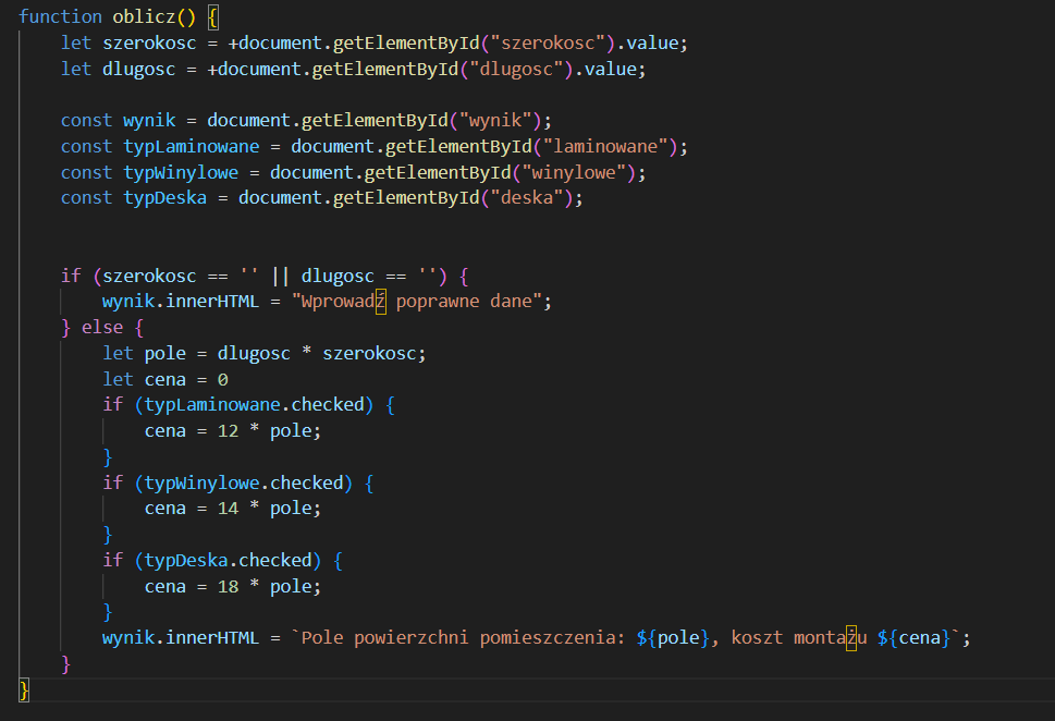 – Funkcja zostanie wywołana np. po kliknięciu przycisku (np. <button onclick=”oblicz()”>).