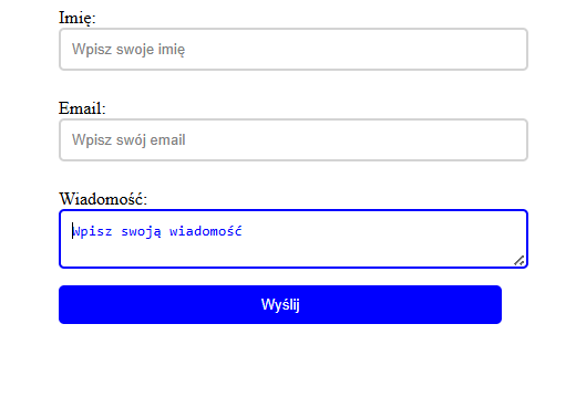 :focus), zmienia się kolor obramowania.::placeholder) jest szara, a gdy użytkownik wpisuje dane, zmienia kolor na niebieski.:hover) i jest wizualnie wciśnięty po kliknięciu (:active).